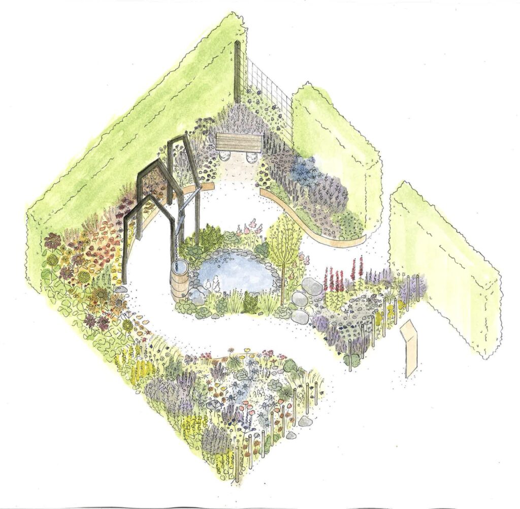 I trädgården Den vattenvisa trädgården vill man visa hur man kan anpassa trädgårdar till skiftande klimat med både torka och stora mängder regn. I trädgården kommer stora grusrabatter anläggas med växter som klarar torka bra och en damm kommer byggas för att leda bort och ta hand om överflödigt regnvatten.